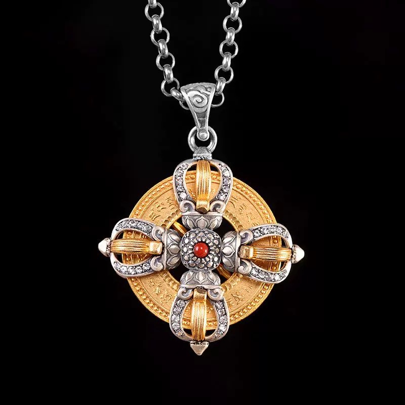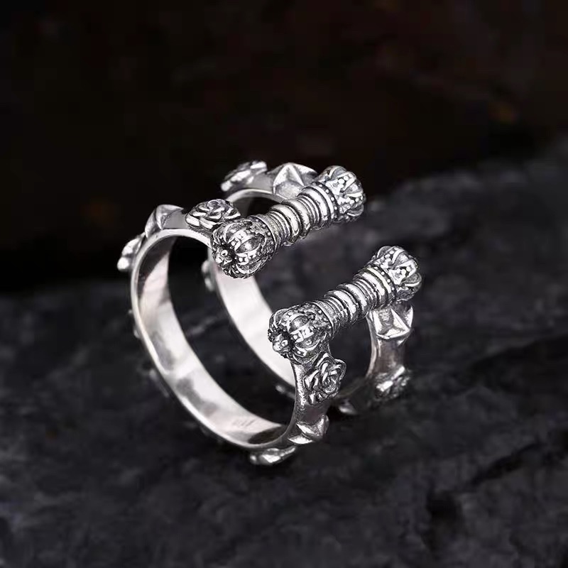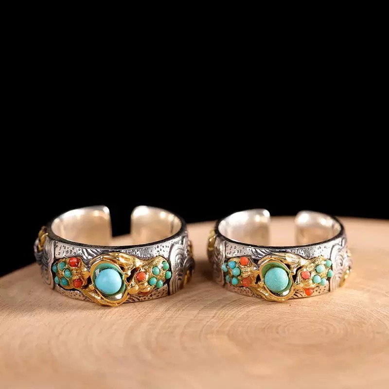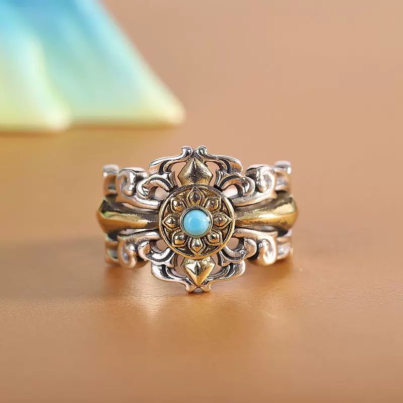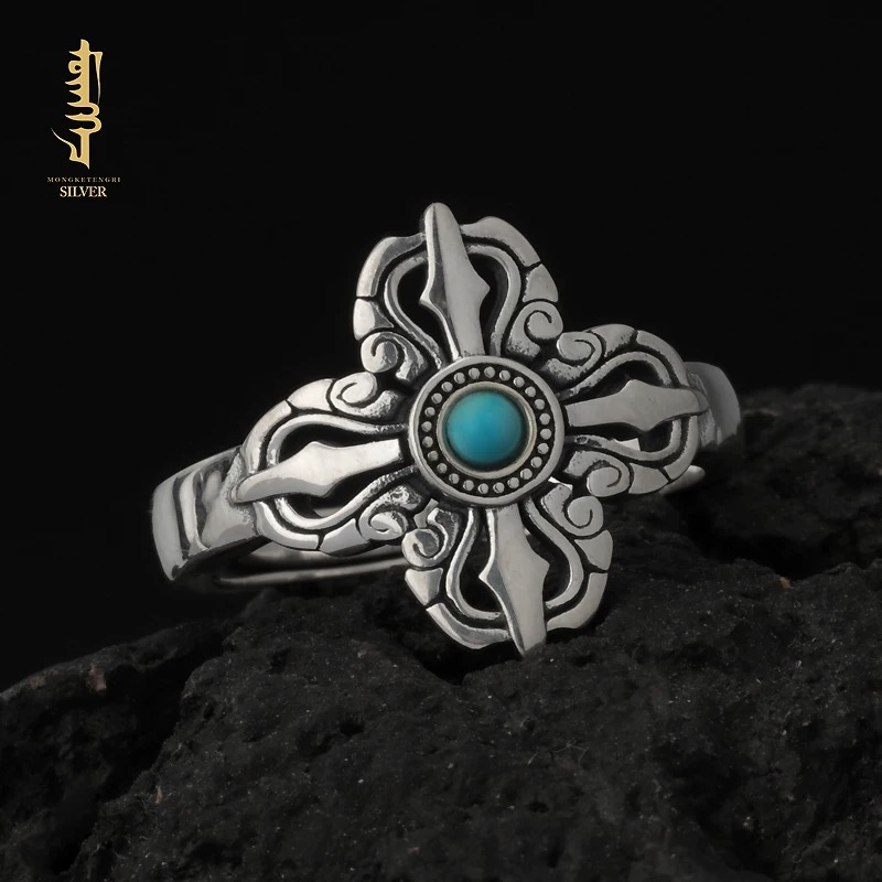 蒙客银戒指男十字降魔杵s925银指环镶嵌天然绿松石金刚杵复古情侣