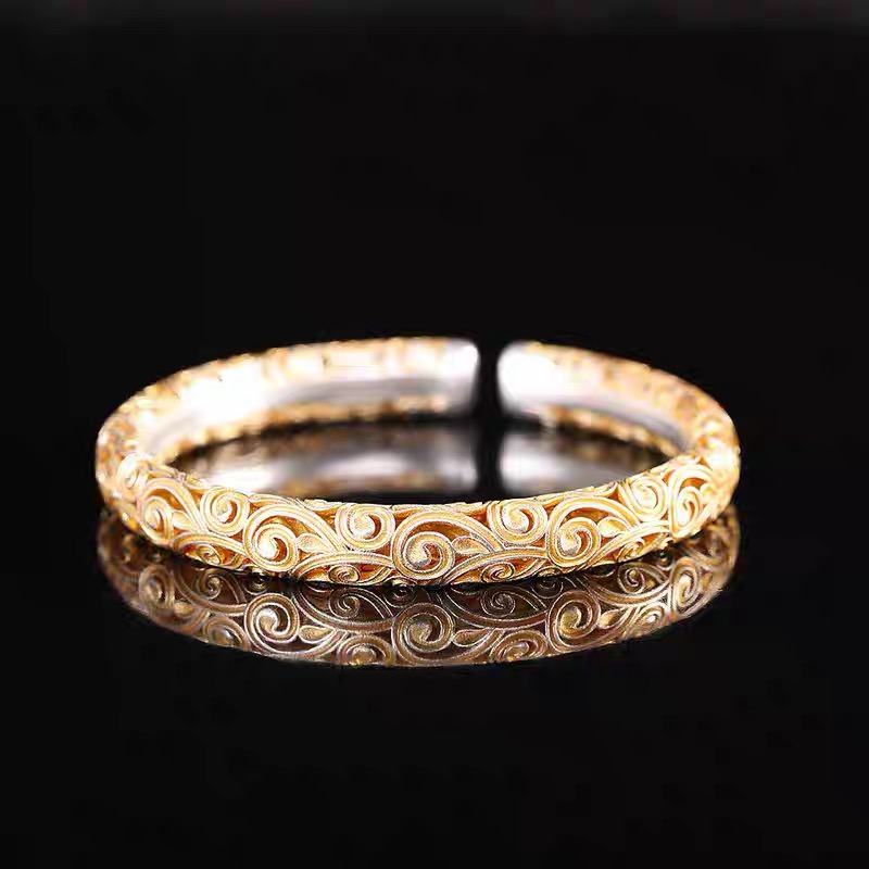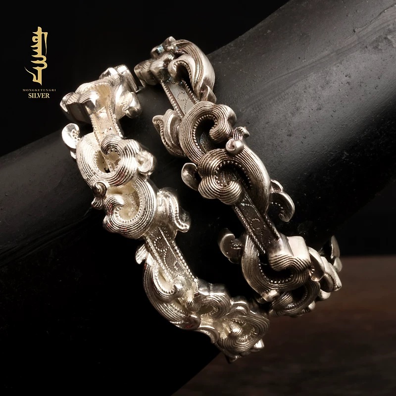 銀 透かし模様 高浮彫り 無垢 アンティーク風 メンズ民族風ブレスレット/纯银镂空花纹高浮雕手复古男手环民族