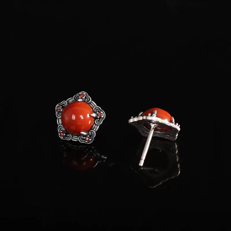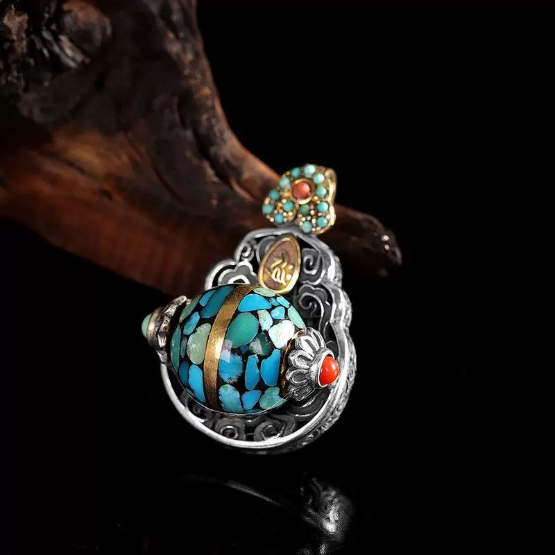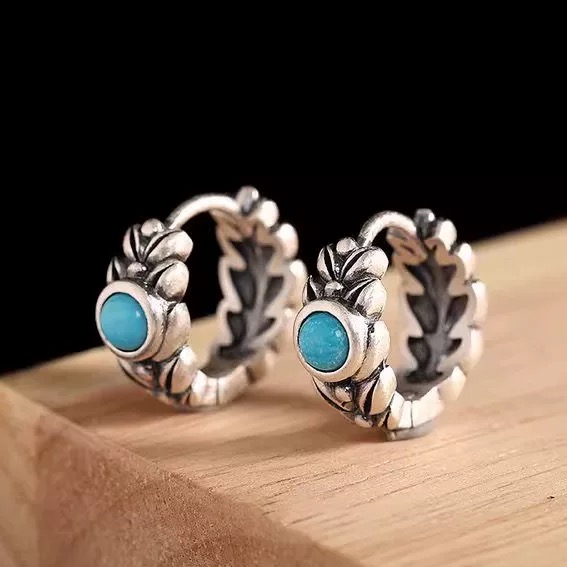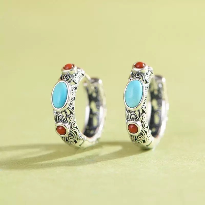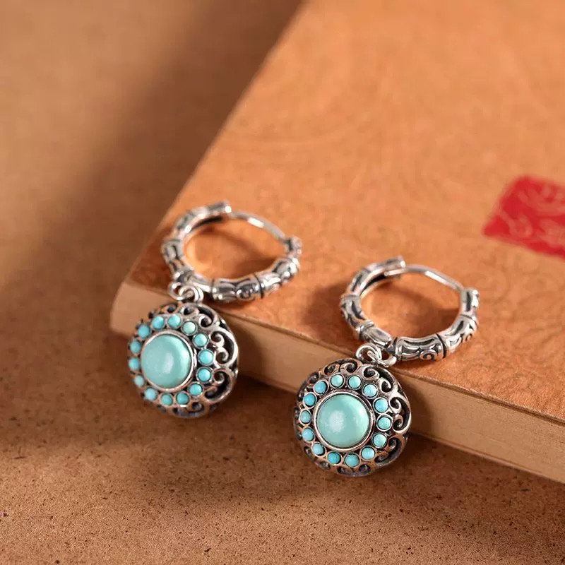 シルバー インレイ ターコイズ ピアス 透かし彫りデザイン モンゴル風イヤリング アンティーク風 ラグジュアリーヴィンテージイヤアクセ/银镶嵌松石耳坠镂空设计蒙古耳环做旧轻奢复古耳饰