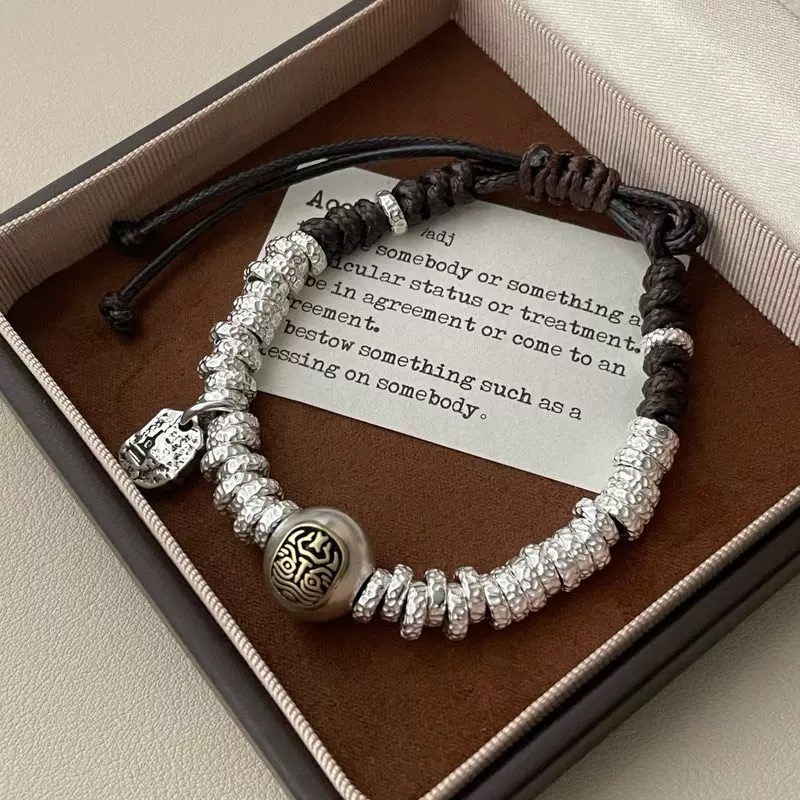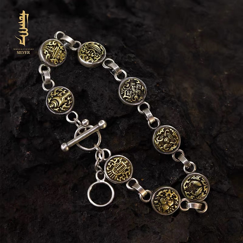 吉祥八宝ブレスレット 男女兼用 開運 ヴィンテージ 民族風 ラウンドビーズ シルバーブレスレット メンズブレスレット ペアアクセサリー /吉祥八宝手链男女款转运复古民族风圆珠银手链男手串情侣