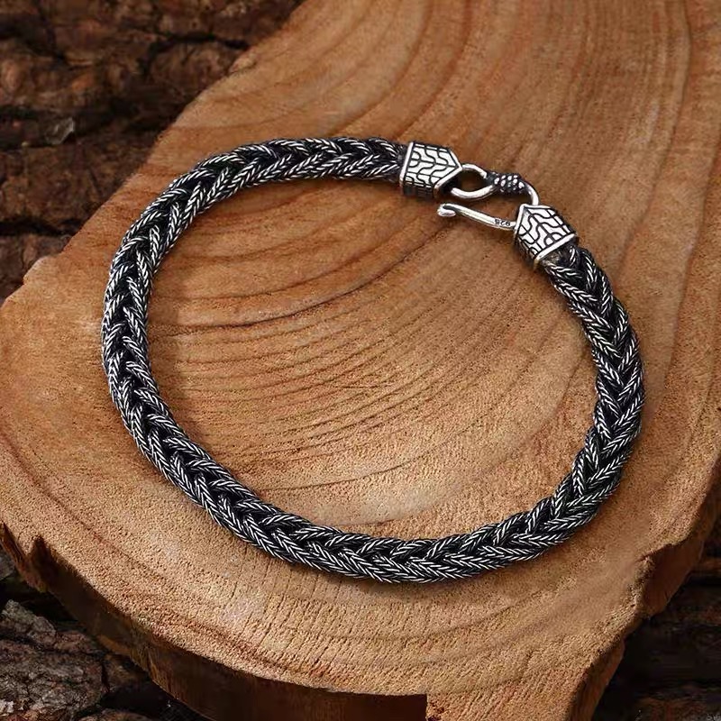 シルバー ハンドメイド 編み込みブレスレット ブラック 男女兼用 太めタイプ タイシルバー ヴィンテージ加工 トレンド 民族風 /银手工编织手链黑色男女粗款泰银复古做旧潮流民族风